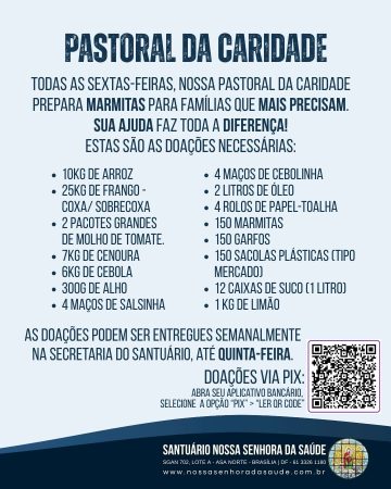 Sem categoria › 18/01/2026 Projeto Sexta da Caridade Conteúdo relacionadoArraiá da Saúde 2024Escola de Formação Permanente – Setembro 2023Encontro de Preparação para o BatismoOficinas de Oração e Vida – Duas turmas