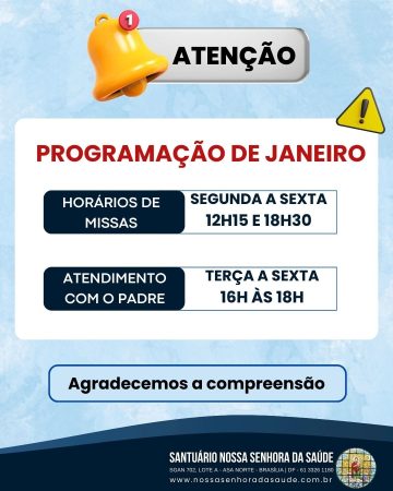 Notícias do Santuário › 14/01/2026 Durante o mês de janeiro de 2026 Conteúdo relacionadoMissa Votiva em Honra a Nossa Senhora da SaúdeReza das Mil Ave MariasOficina de Oração e VidaEncontro de Jovens com Cristo (EJC)