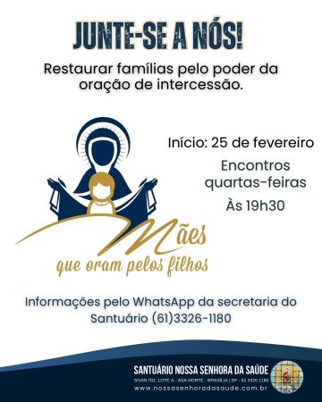 Notícias do Santuário › 02/03/2026 Mães que Oram pelos Filhos Conteúdo relacionadoNovena da Misericórdia / Festa dia 24 de abril às 15hAvisos Semana de 2 a 8 de novembroOficinas de Oração e VidaMissa Votiva em Honra a Nossa Senhora da Saúde