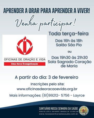 Sem categoria › 28/01/2026 Oficinas de Oração e Vida Conteúdo relacionadoMissa Votiva em honra a Nossa Senhora das DoresFesta da Apresentação do Senhor – Trazer velaMissa Votiva em Honra a Nossa Senhora da SaúdeDia dos Avós terá como tema “A sua misericórdia se estende de geração em geração”