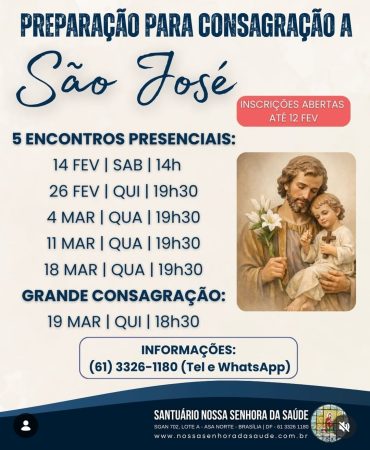 Notícias do Santuário › 10/02/2026 Preparação para Consagração a São José Conteúdo relacionadoMissa em Ação de Graças pelos 26 anos de Dedicação da IgrejaSemana Santa 2023Formação Pastoral da SaúdeQuaresma de São Miguel Arcanjo